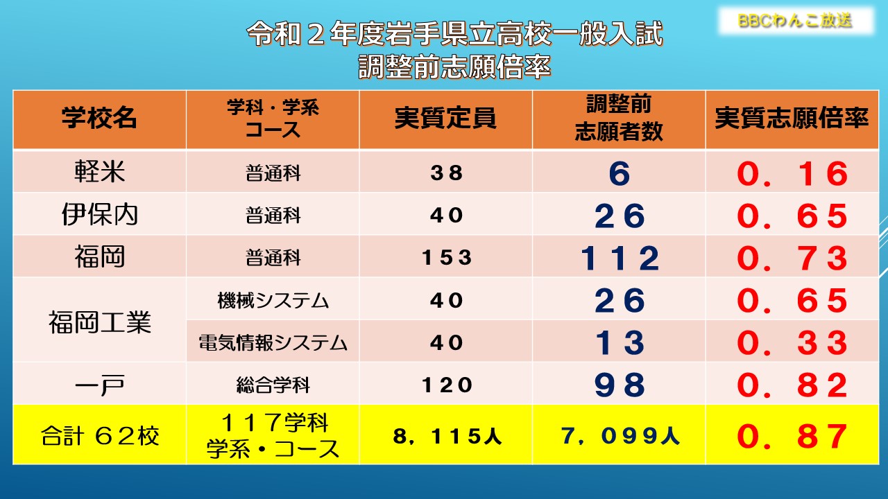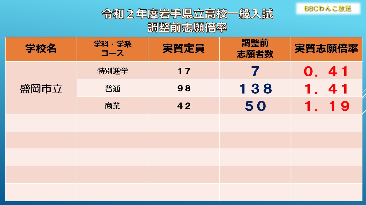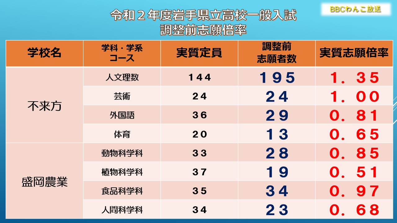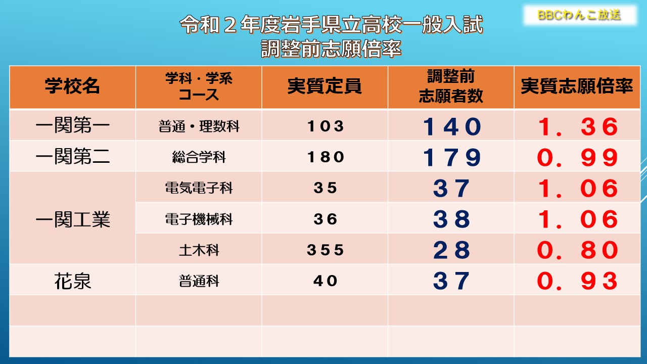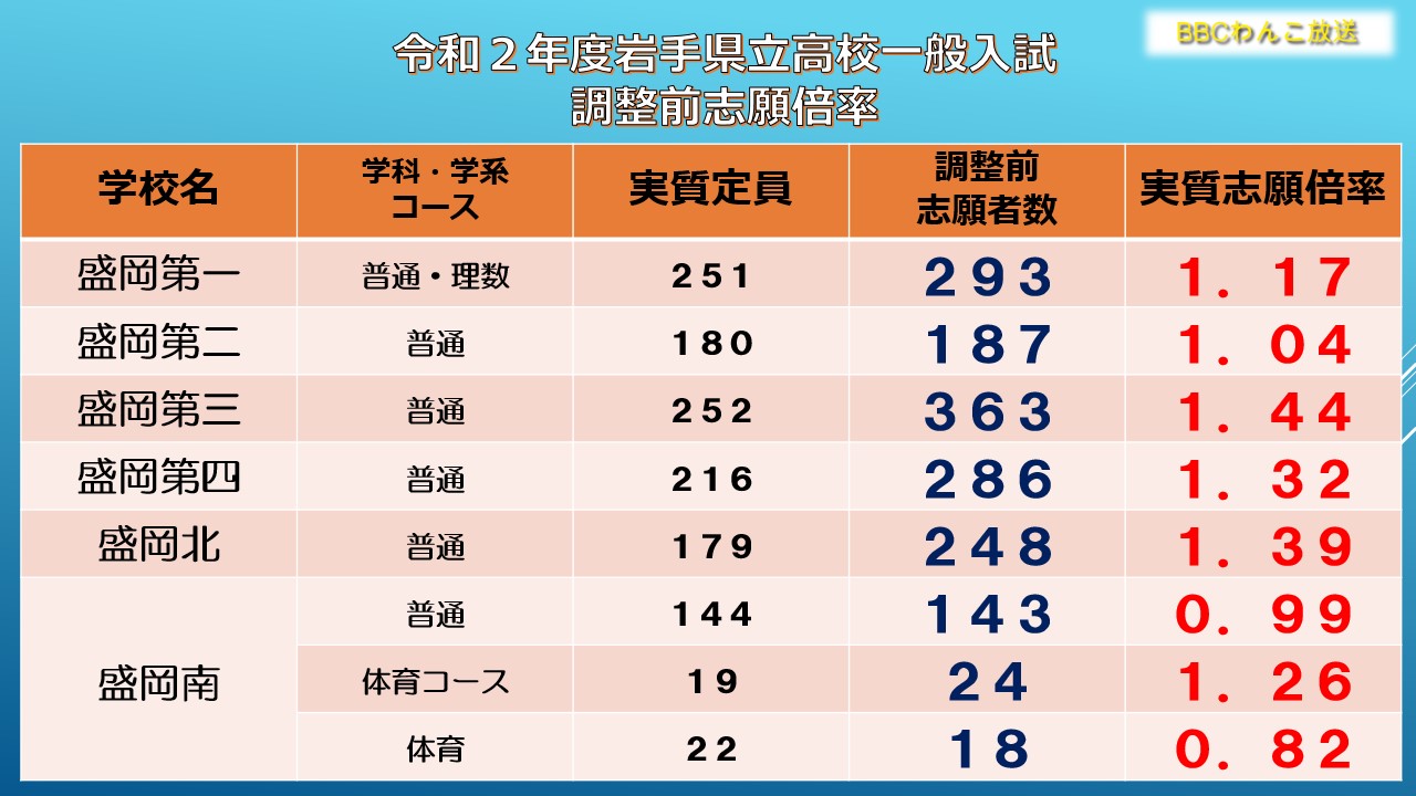 令和2年度岩手県立高校一般入試調整前志願倍率